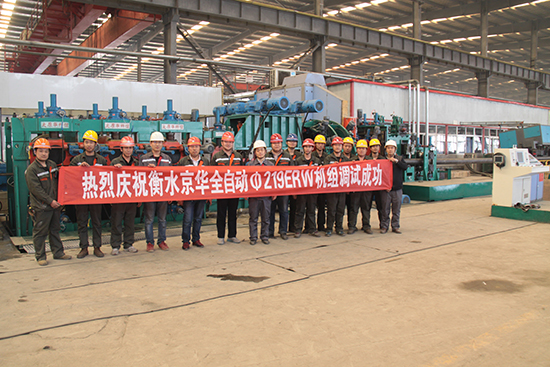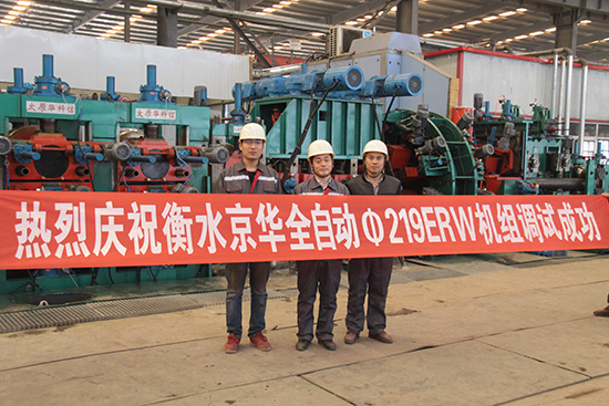 我公司为衡水京华焊管公司设计制作的Φ102-Φ219x12mm全自动不换辊机组于2016年4月试车成功。不换辊圆管机组是我公司开发的新产品,在变换产品规格时,全部成型机部分不用更换轧辊,以前需要更换轧辊的精成型机架在我们的机组上也不用更换轧辊,这样就可以节省大量的轧辊投资,特别适合大型和中型机组。在变换产品规格时,轧辊的调整也实现自动化,只需在工控机上输入管径、壁厚、材质等参数,所有轧辊就会自动调整到合适位置,直接开机喂料进行生产。这样就节省了大量换型时的调整时间,使得多品种小批量订单生产成为可能,增加了机组的作业率,提高机组的开机率。并且全自动电脑换型,还可以使得调整准确,减少人工调整的误差,提高机组的成品率,增加机组的经济效益。