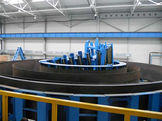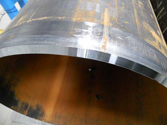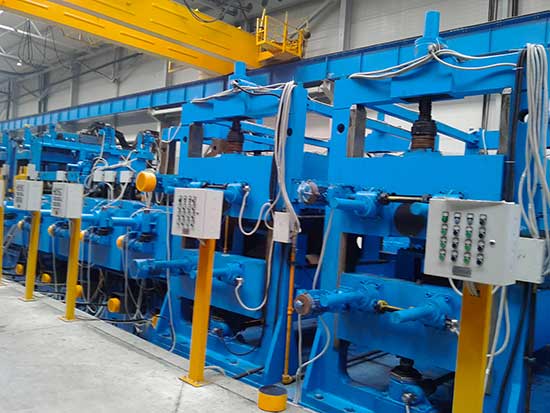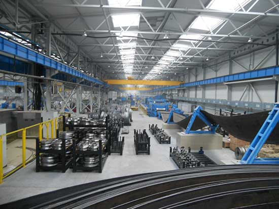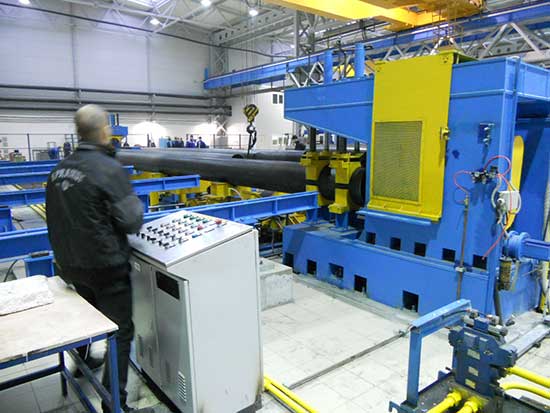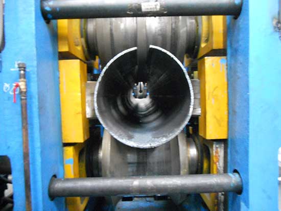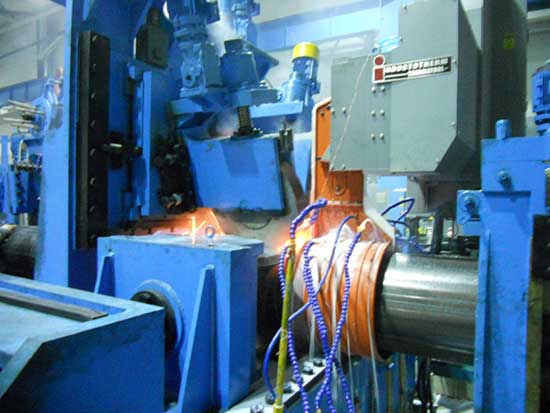 我公司为俄·罗斯切尔内钢管公司设计制作的Φ219-Φ530x16mm直缝高频焊管机组已于2013.12月顺利完成试车,累计生产了50万吨钢管。该机组采用我公司新型技术,柔性成型,全自动换型调整。初成型段全部不用更换轧辊,只需要在电脑上输入管径、厚度、材质等参数,轧辊自行到达位置,直接开始生产。精成型及定径段采用快速换辊技术。这两项新型技术的应用,开始使换型时间缩短到1-2小时。机组配备我公司新研发的API标准平头倒棱机,确保能够真正达到API要求。机组配备60MPa大间隙密封高压水压机。